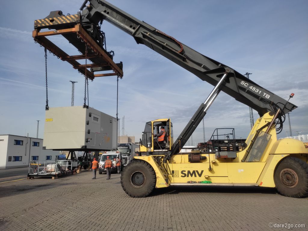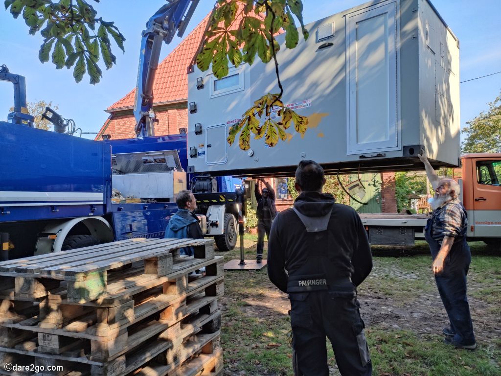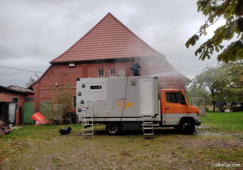 First we had to clean the camper fastidiously to comply with Australian quarantine rules, and then bring it to the port of Bremerhaven. Luckily, some online acquaintances offered us a space on their farm property, not far from Bremen and Bremerhaven. And they had a friend with access to a crane from the German disaster support services [THW].