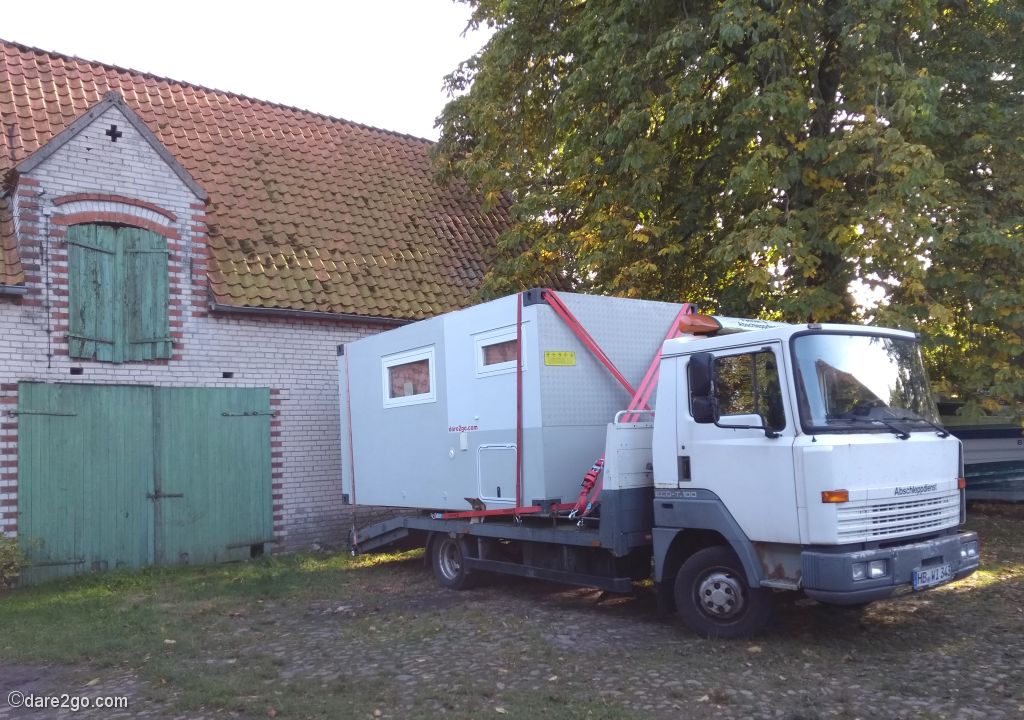 In Germany this step is called “Hochzeit” [wedding], when you bring truck and camper box together. It’s an exciting moment, a moment we’d been working towards for months. Finally a new vehicle to hit the road with and go travelling. And we missed this very special moment!