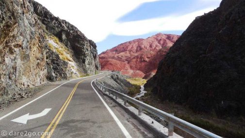 After around 40 kilometres we entered Quebrada Las Angosturas – a narrow gorge along a serpentine winding road. Around each bend a new vista of amazing mountain structures and colours came into view. In the light that day, the red seemed even more vibrant than the red mountains we have seen before. Stunning! The road rises sharply through this part and we reached 3000m in no time.