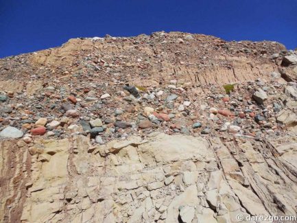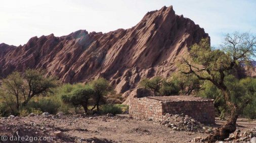 As expected, the road goes up and up and up… Initially it is a relatively gradual climb along gently curving roads. The mountains are impressive with markings showing the folding and faulting of millennia. There are layers studded with different coloured pebbles; mountains that look just like marbled paper; mountains that seem to be ‘falling apart at the seams’; and a dry riverbed with pebbles of all sizes and most colours. We also passed a few buildings made out of the materials at hand, but they mostly looked abandoned.