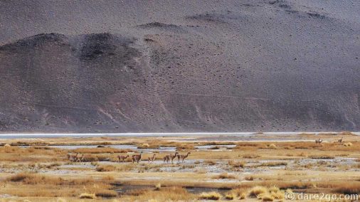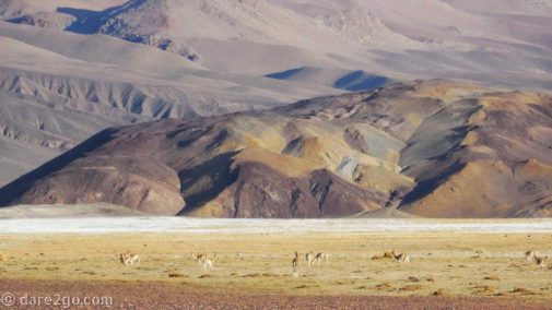 From there we were on a plateau of sorts: the road was still rising but very gently. The terrain included salt flats and lagoons, some vegetation and mountains whose variety of colours and shapes kept us awestruck. In between, we were also pleased to spot small herds of vicuñas, and also a very few flamingos.