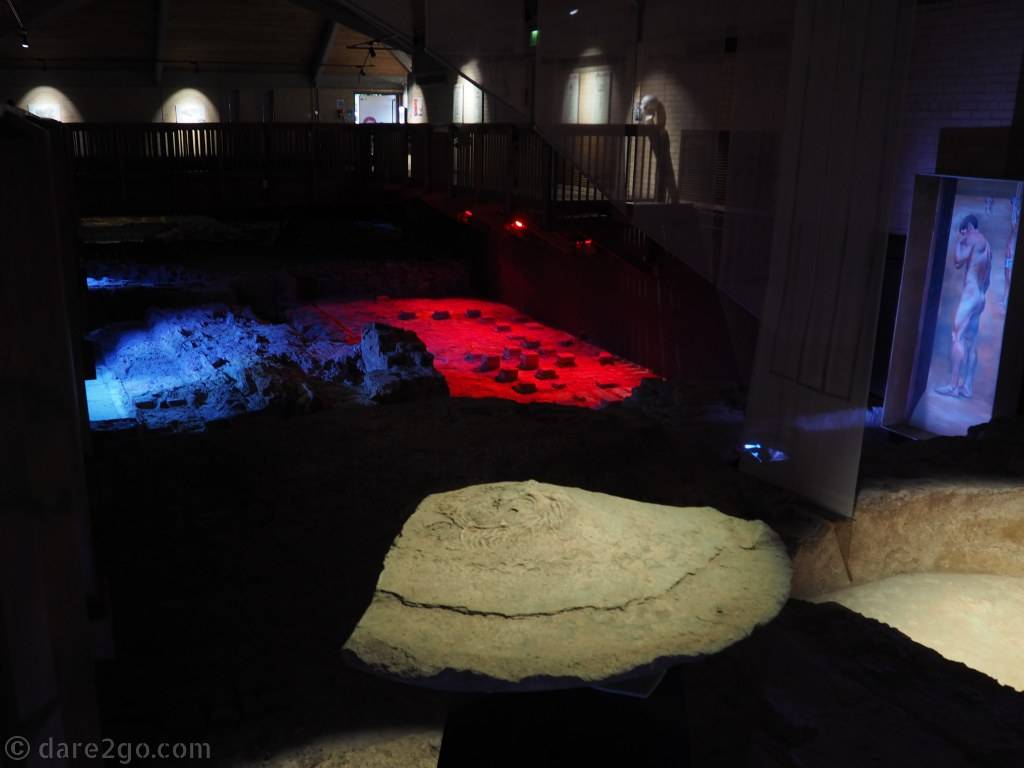 - Caerleon Roman Fortress & Baths: audio-visual technology helps us visualise how these baths would have been when they were in use. e.g. The red highlights part of the under floor heating system the Romans used.
