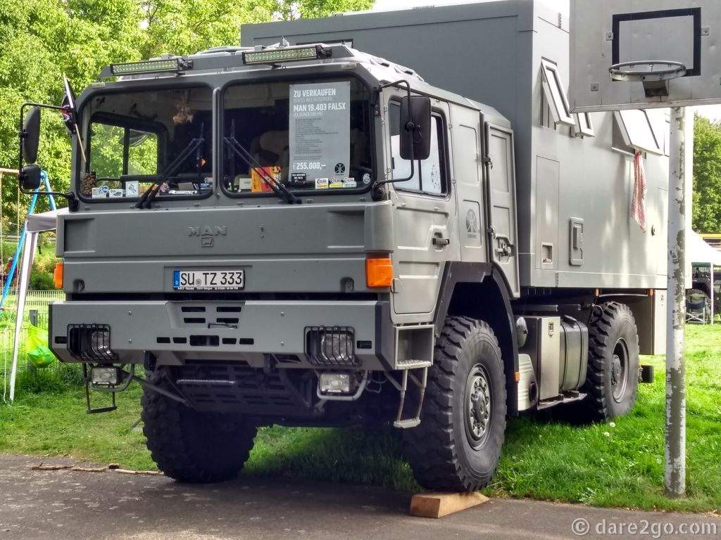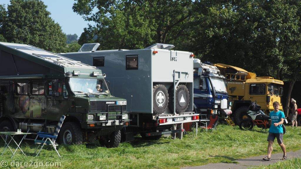 Expedition vehicles come in all sizes and colours! Here a line-up at the Willys Meeting Registration sometime on Saturday. From left to right: an older Landrover Discovery in Camel Trophy look, a Mercedes Vario 4×4, a large MAN expedition truck, and an even larger double-decker bus (not much of it in the photo).