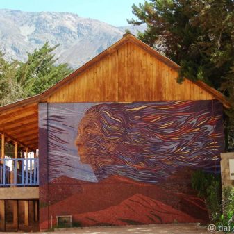 Most of our nights in the Elqui Valley were spent parked in what would have been the dam (had it been full) near a village with the impossible-to-pronounce name of Gualliguaica. It was a wonderful place to sleep – no lights, no dogs, no roosters, no noise – and we even got good mobile internet. We would drive the 10Km into Vicuña to shop at the supermarket, bakery and the weekly fresh food market when we needed to, then return to the embalse. It was on this part of the road that we noticed, and started to photograph, the mosaic-adorned bus stops .