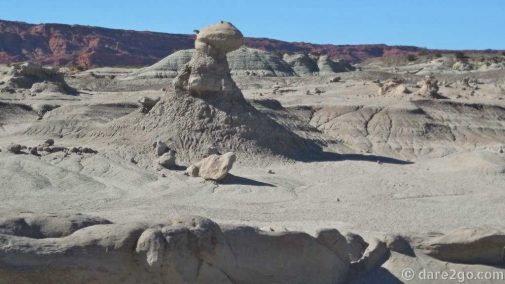 Ischigualasto: El Hongo (the mushroom) in front of the amazing tall red cliffs
